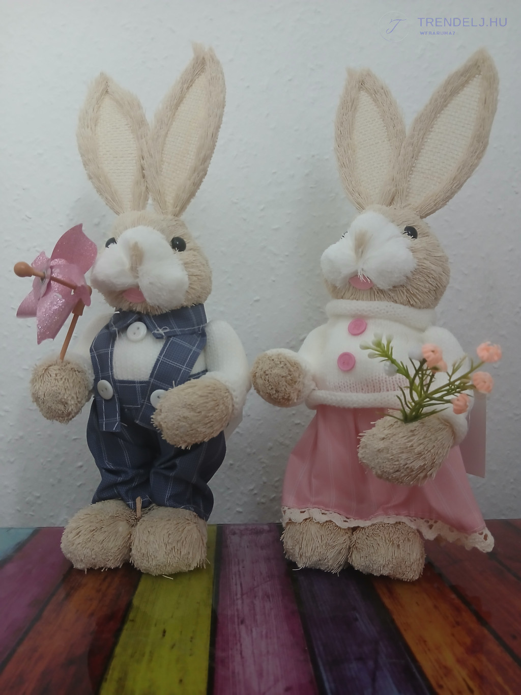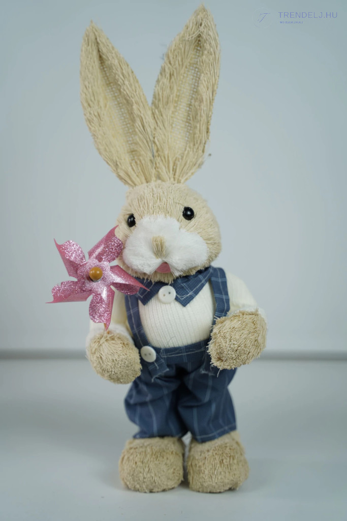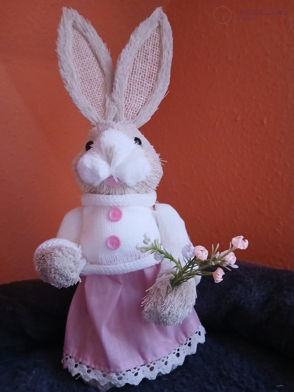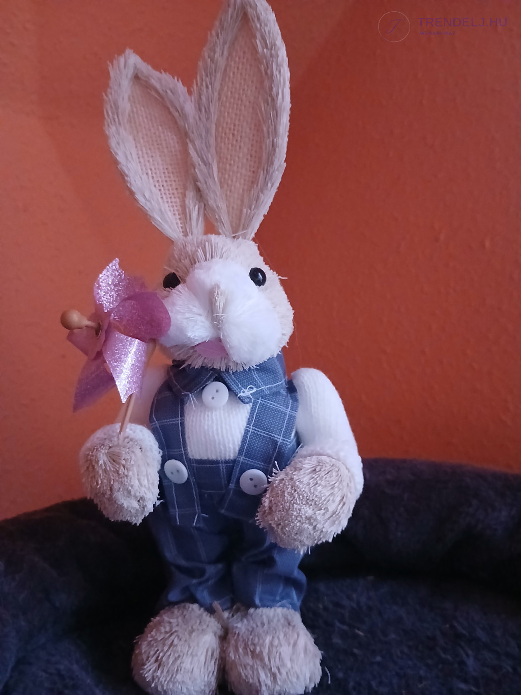 Stílus: Húsvéti tematikájú ruhákba öltöztetett nyuszi (kertészruha, szoknya, kiegészítők: szélforgó, virág).