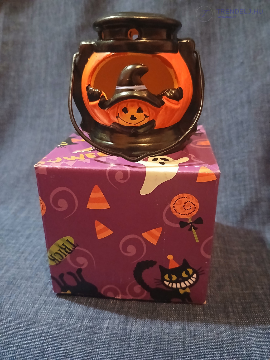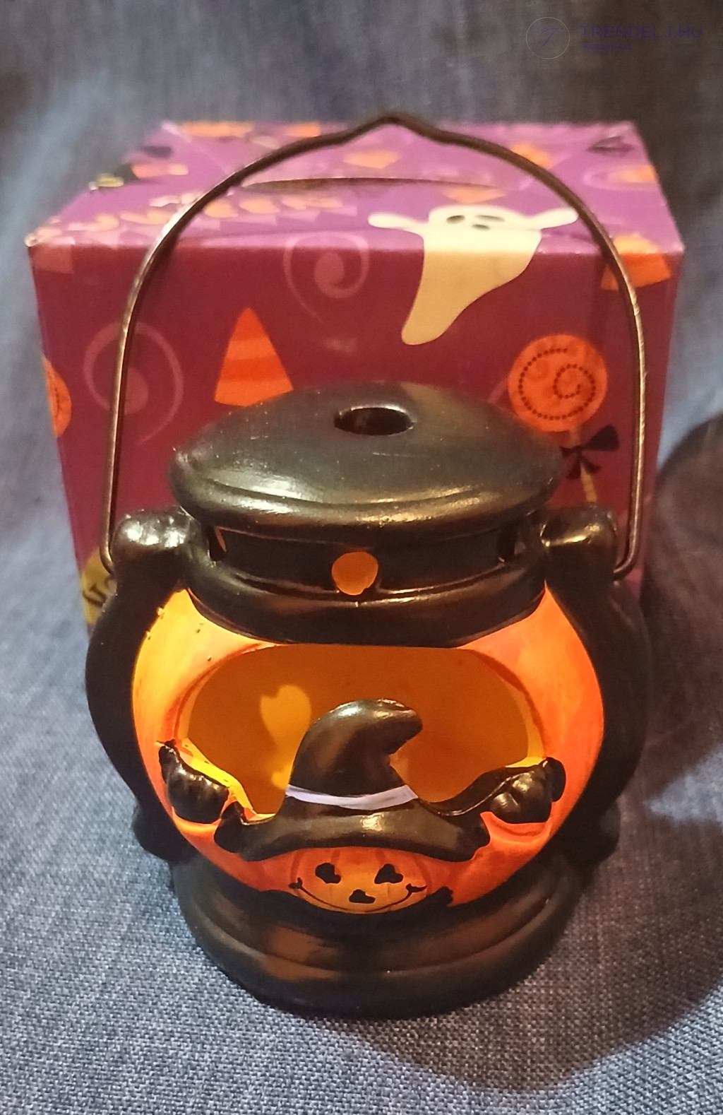 Halloween kerámia dekoráció - töklámpás LED világítás, fém akasztó