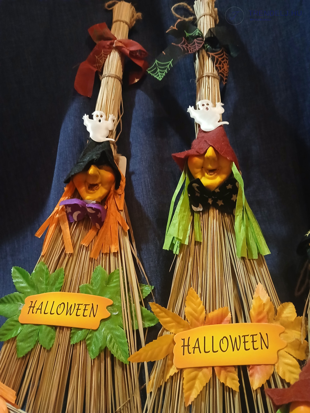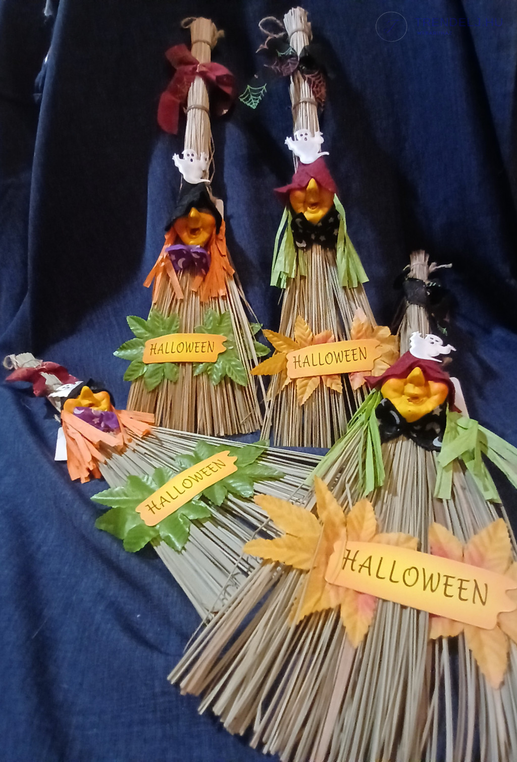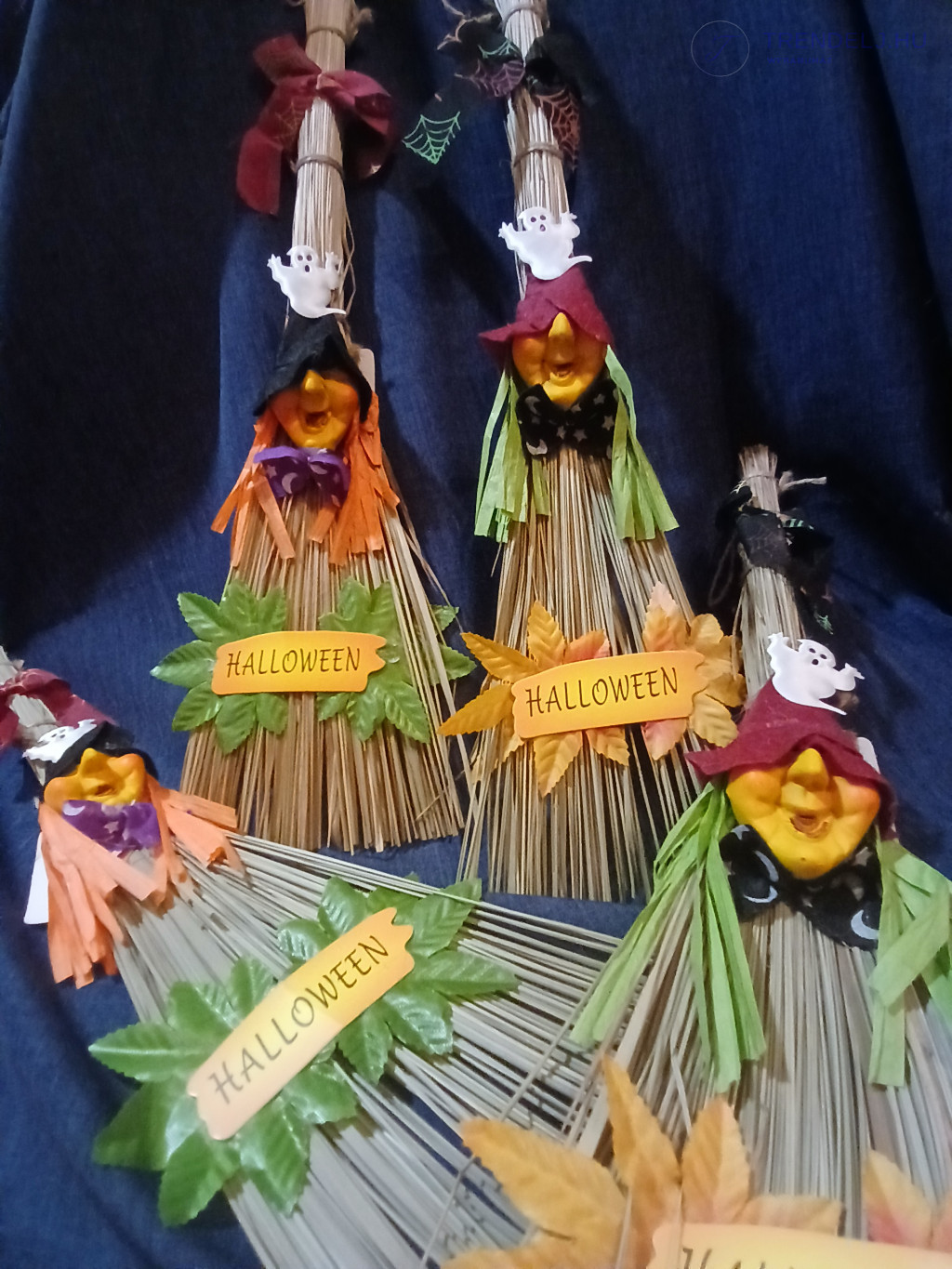 A seprűk természetes szalmából készültek, és mindegyiken egy-egy boszorkányfej található, fekete vagy bordó sapkában,