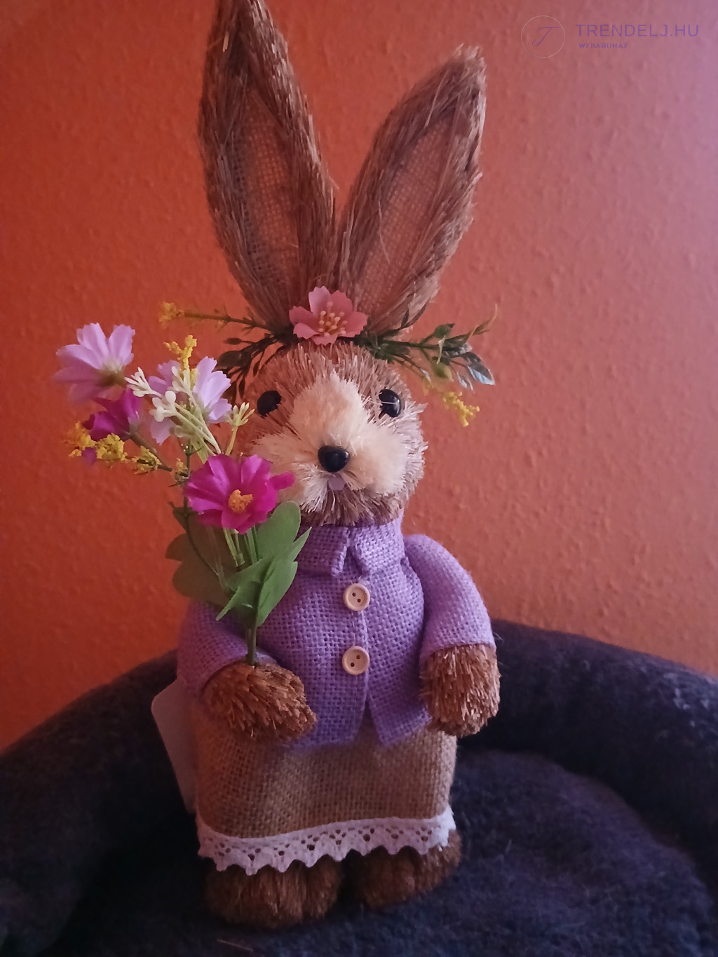 Stílus: Húsvéti tematikájú ruhákba öltöztetett nyuszi (kertészruha, szoknya, kiegészítők: tojás, virág).